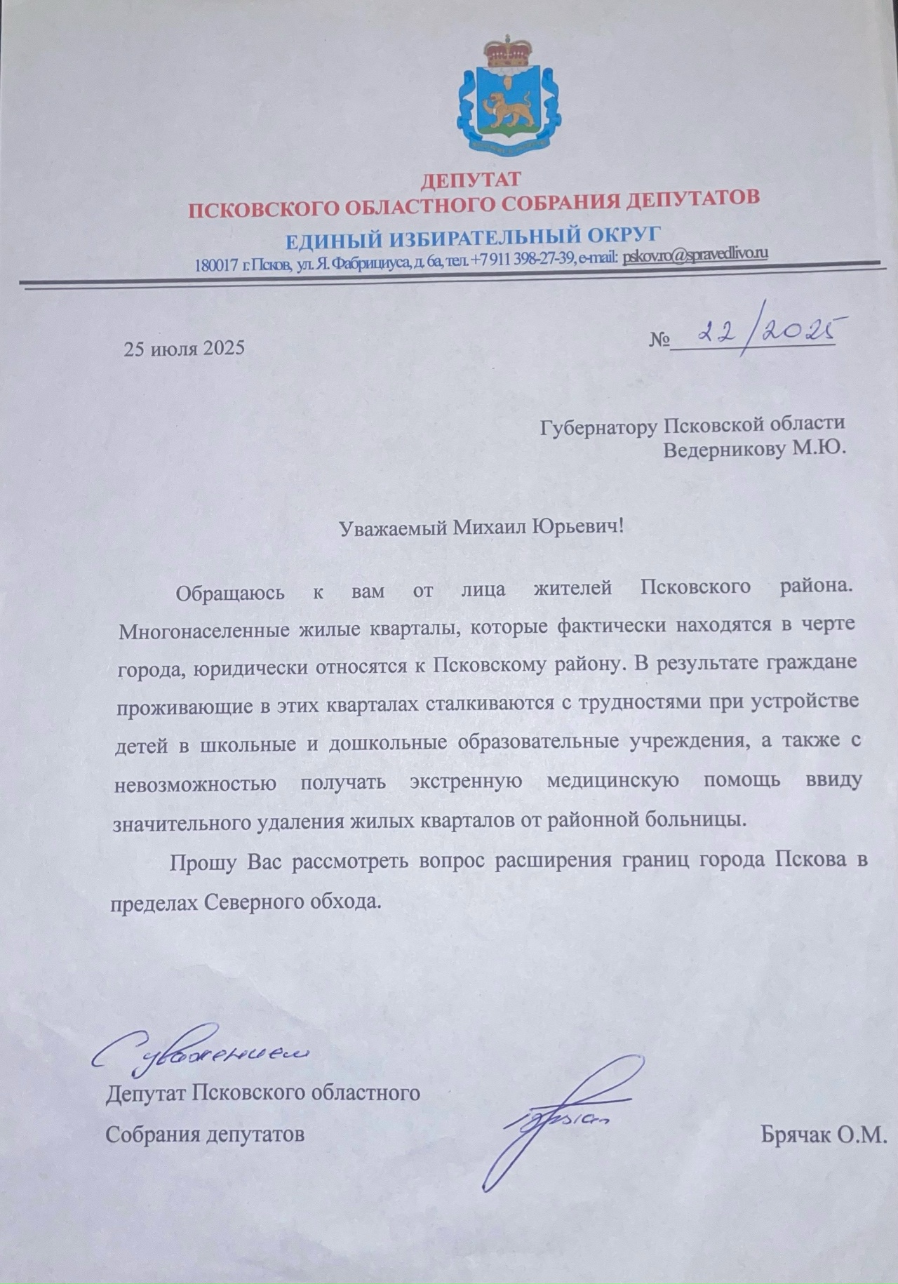 Депутат Псковского областного Собрания Олег Брячак сообщил, что завершил сбор подписей жителей по обращению к губернатору Псковской области.