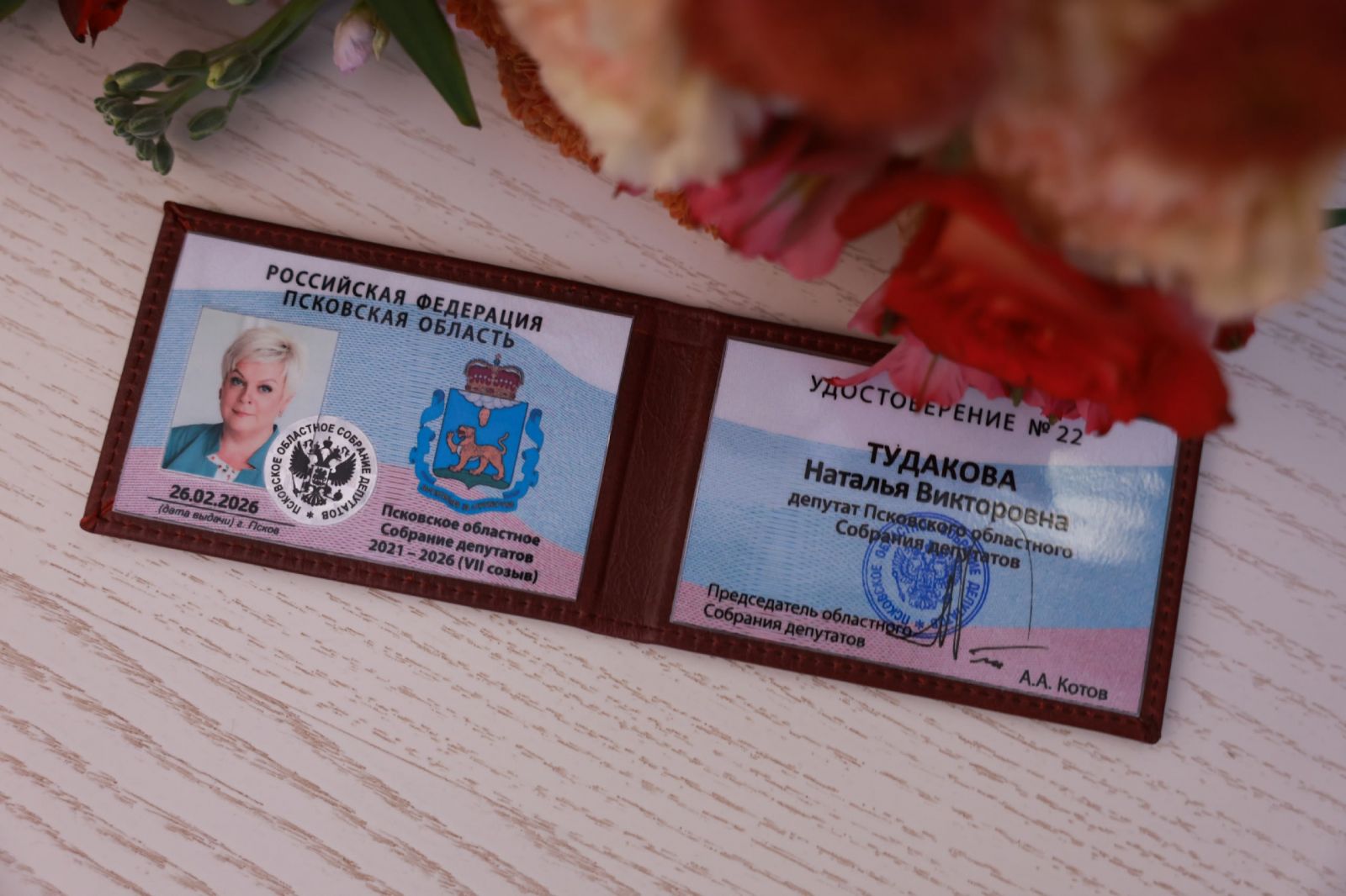 На вручении удостоверения председатель областного Собрания Александр Котов поздравил Наталью Тудакову и пожелал ей работы на благо избирателей.